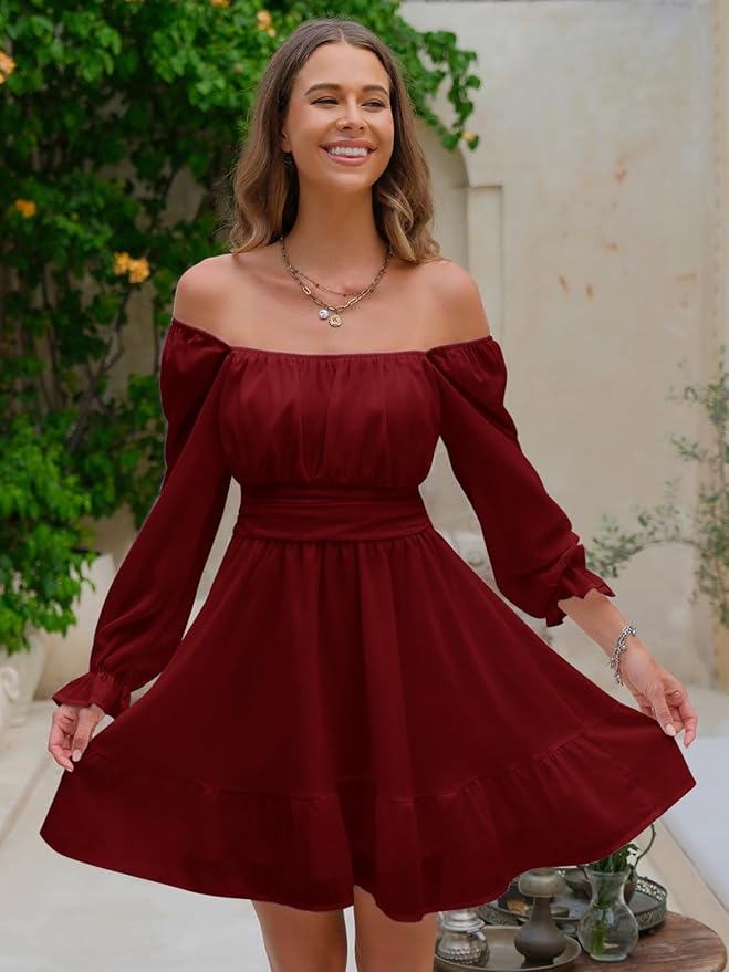 - Feature: tie back, square neack, ruched bust, smocked waist, elastic high waist, lantern sleeve, long sleeve, elastic cuff, above knee length, A line, slim fit, swing and elegant vintage chiffon dress.