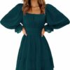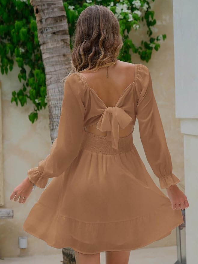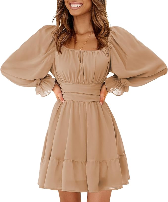 - Feature: tie back, square neack, ruched bust, smocked waist, elastic high waist, lantern sleeve, long sleeve, elastic cuff, above knee length, A line, slim fit, swing and elegant vintage chiffon dress.