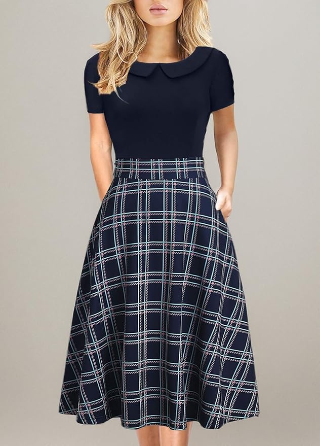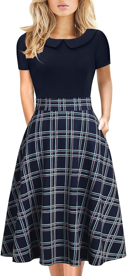 - Design: Peter pan collar, short sleeve, zipper on the left of the dress. It has pockets on each side, knee length. The fabric feels soft and comfortable.
