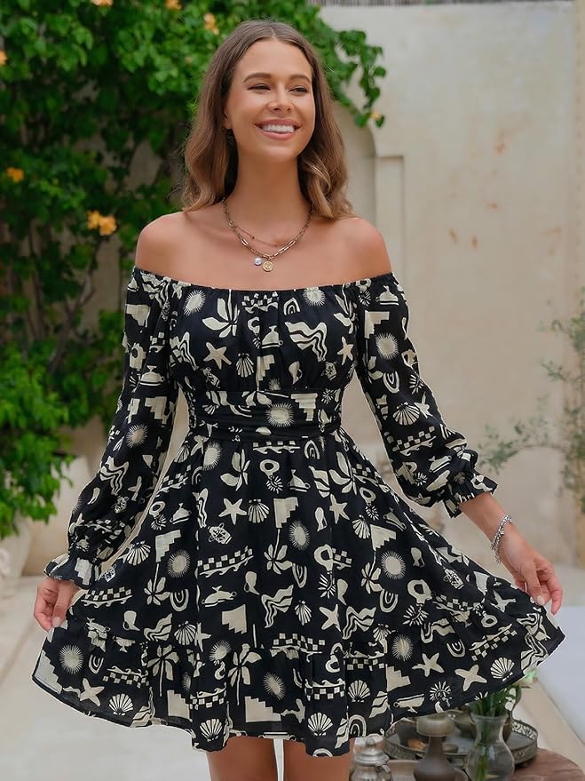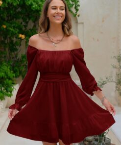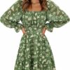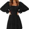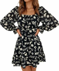 - Feature: tie back, square neack, ruched bust, smocked waist, elastic high waist, lantern sleeve, long sleeve, elastic cuff, above knee length, A line, slim fit, swing and elegant vintage chiffon dress.